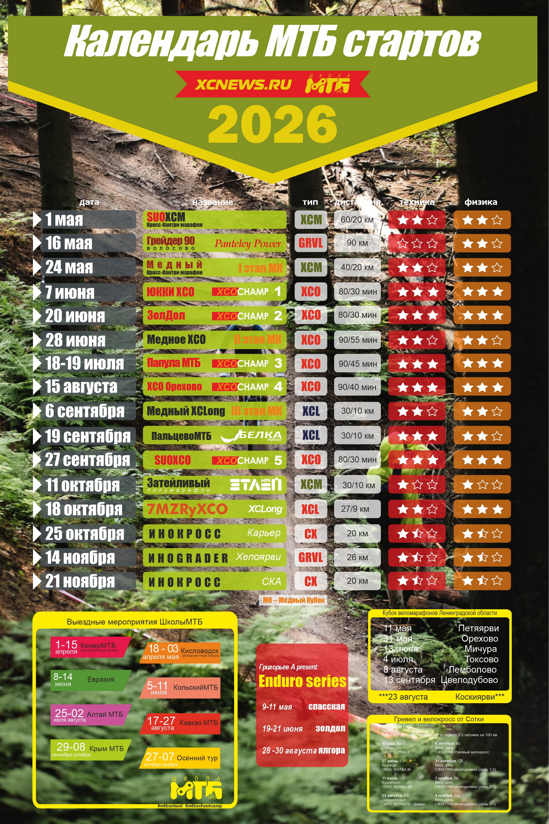 Помимо традиционных мероприятий мы внесли в календарь марафон в Суоранде от известного МТБ-сомелье Ивана Иноземцева, который состоится 1 мая, и гревел заезд на 90 км в Волосовском районе в память нашего друга Андрея Пантелеева, который состоится 16 мая. И три этапа Инокросса осенью.