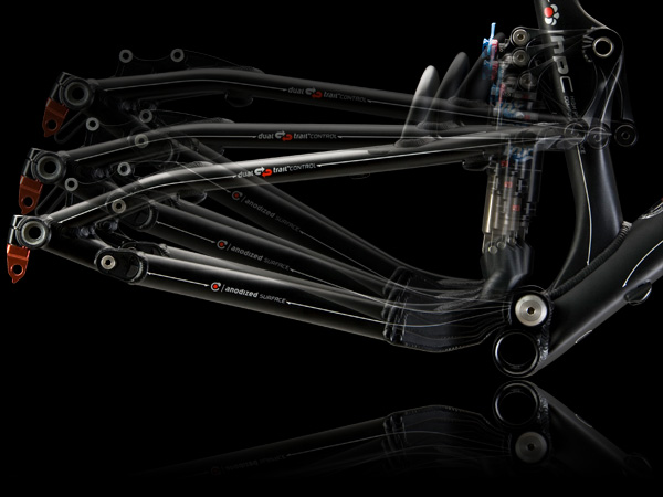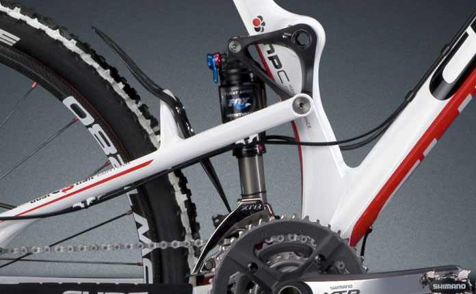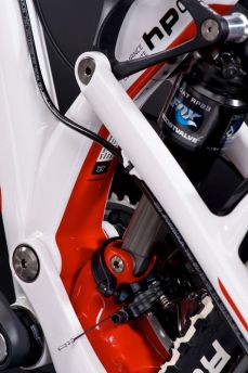 Первое, что хочется отметить байк определенно «цепляет», притягивает к себе внимание. На Sting HPC используется патентованная подвеска Dual Trail Control, предусматривающая расположение амортизатора в заднем треугольнике рамы. По заверениям Cube, это позволяет обеспечить практически нулевую отдачу в педали, сохраняя при этом качественную обработку всех неровностей. Рядом с амортизатором Fox Float RP23 присутствует маленькое карбоновое крыло, защищающее его от грязи (что, надо отметить, весьма не лишне). Передняя (основная) ось линка, к которому крепится амортизатор и верхние перья, сделана полой для уменьшения веса.