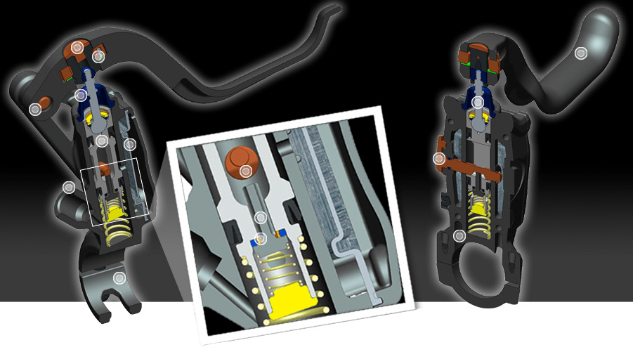 Вчера Hayes опубликовали все недостающие подробности, касающиеся работы дисковых тормозов Prime. На момент их анонса центральная часть корпуса была «зацензорена». Как и предполагалось, в этом месте оказался регулятор точки контакта колодок с тормозным диском. Основная хитрость заключается в том, что поршень мастер-цилиндра полый: в нижней его части (которая ближе к рулю) присутствует камера, сообщающаяся с основным объемом мастер-цилиндра через отверстие в стенке поршня. Низ камеры закрыт пластиковой заглушкой, а в верхней ее части находится подпружиненный перепускной клапан. Поршень этого клапана верхней своей частью упирается непосредственно в регулятор точки контакта колодок. Регулятор является своего рода эксцентриком, и может поворачиваться на 180 градусов. При вращении меняется и начальное положение перепускного клапана. Когда упор регулятора находится в крайнем верхнем положении, перепускной клапан закрыт, и при нажатии на тормозную ручку DOT из мастер-цилиндра сразу же выдавливается в гидролинию. В нижнем положении упора регулятора перепускной клапан остается открытым до тех пор, пока поршень мастер-цилиндра не опустится на некоторое расстояние. Т.е. при нажатии на тормозную ручку DOT сначала свободно циркулирует внутри мастер-цилиндра, перетекая из основного объема в полость внутри поршня через перепускной клапан, и только после закрытия клапана начинает поступать в гидролинию. Особенностью такой конструкции является то, что регулировка точки контакта колодок не влияет на положение мастер-цилиндра и, соответственно, тормозной ручки.