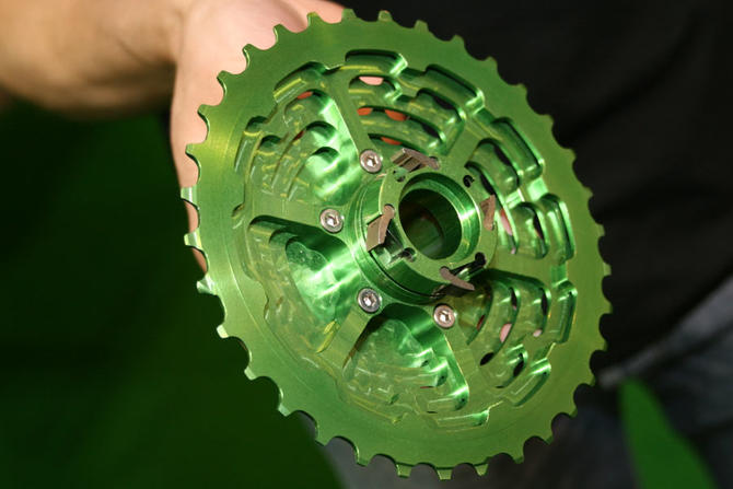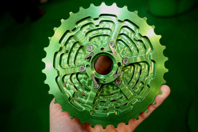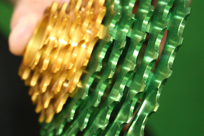 5 больших звезд кассеты (зеленые) изготовлены из цельного куска алюминия, в то время как 5 маленьких (золотые) изготовлены из стали, покрытой нитридом титана. Что характерно, кассета имеет совершенно нестандартный набор звезд: 9-34. Таким образом, расширяется диапазон передаточных соотношений, и эквивалент 44-11 при использовании этой кассеты будет достигнут при звезде 36Т спереди. С другой стороны, вопрос о снижении КПД на таком соотношении остается открытым.