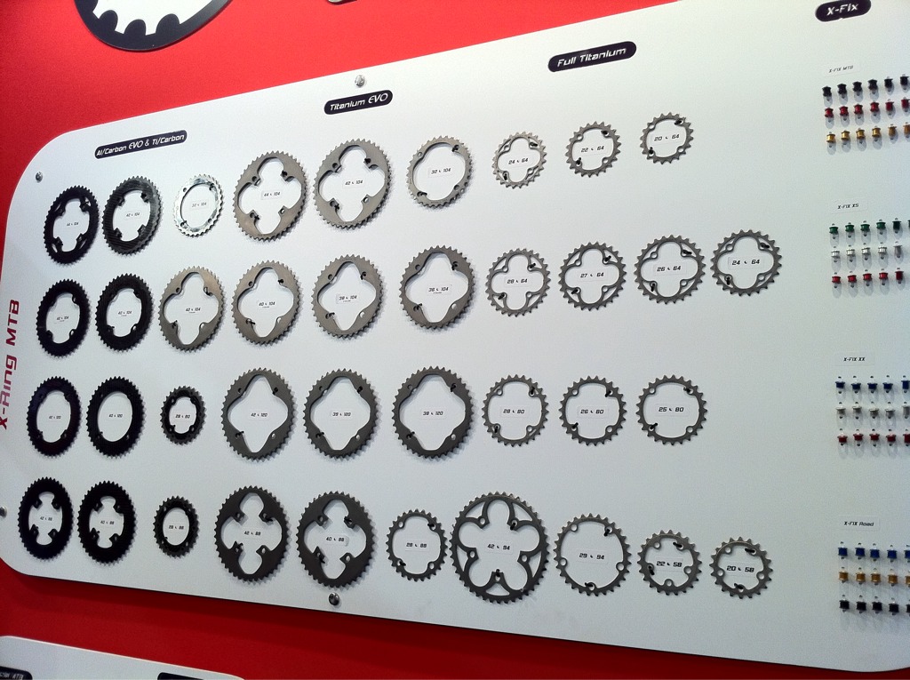 Контора с лаконичным названием Carbon-Ti представила на Евробайке передние звезды сделанные, как подсказывает К.О., из титана и углеродного волокна. Помимо полностью титановых больших звезд весом порядка 60 грамм на стенде также присутствуют комбинированные варианты алюмиевая зубчатая часть на карбоновом пауке (вес в диапазоне от 50 до 60 грамм). Вес малых звезд, сделанных по аналогичной технологии, колеблется от 25 до 28 грамм.