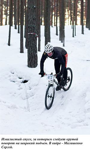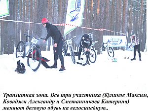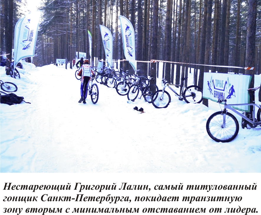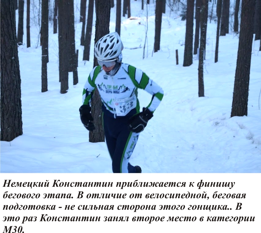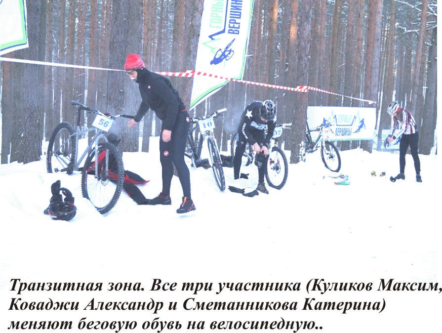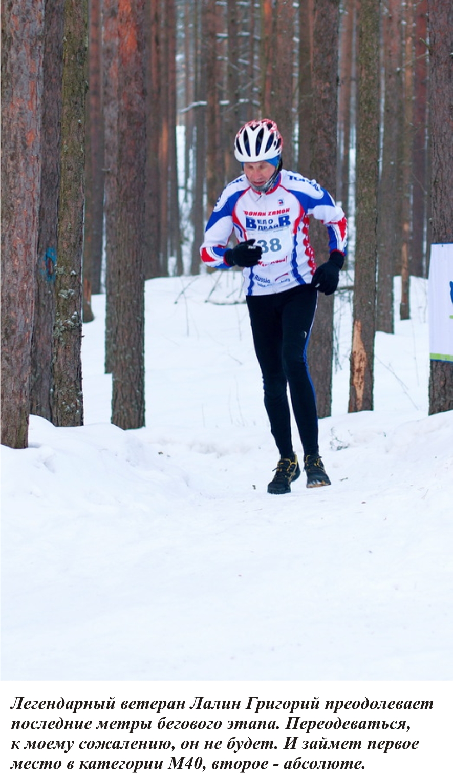 Велоэтап по погодным условиям мы сократили до двух кругов. И это было очень кстати: на втором велокруге у меня начали замерзать пальцы рук. В целом велоэтап прошел для меня очень спокойно (даже нейтрально, прямо как это нейтральное предложение) я никого не догонял, меня никто не догонял. Даже несмотря на неработающее переключение передач и сдувшуюся вилку. Вилка доставляла некоторые неудобства на спусках, а вот новая синглспидная суть моего велика меня ничуть не огорчала. Было даже интереснее запасать скорость на спусках, чтобы не сильно «заламываться» на последующих подъемах. На втором велокруге я уже хорошо вкатился в трассу и почти перестал замечать встречающиеся колеи.