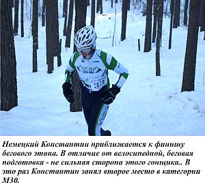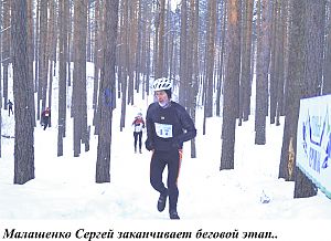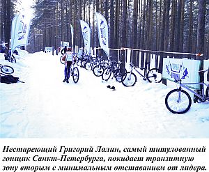 Подъехали все зарегистрированные участники и после короткого брифинга был дан старт. На сей раз я тоже участвовал. Беговой круг начинался широкой грунтовкой под спуск, продолжался широкой асфальтированной дорогой, с которой предстояло по мягкому грунту прибежать к живописной тропинке вдоль реки Сестры. К моему удивлению весь асфальт, всю тропинку группа и не думала распадаться! Только выбежав на второй асфальт Григорий Лалин взвинтил темп и порвал на несколько кусков группу. За Гришей начал отбегать Дмитрий Степанов. Я держался третьим. Забавно было шлепать по асфальту в велотуфлях! Я решил не менять обувь в транзитной зоне, сэкономив на этом время. К моему огорчению, Дмитрий тоже бежал в велоботах. А вот Гриша был в кроссовках, и я серьезно расчитывал обыграть его в транизтке. Тем временем меня, к моему удивлению, начали обходить Рябев Евгений и Куликов Андрей! К финишу бегового этапа я смог опередить Андрея, Но Евгений оказался впереди. Но еще большее огорчение ждало меня в транизтной зоне. Вернее, не ждало, а уехало! Гриша не стал одевать велосипедные ботинки, поехал в кроссовках. Мои стратегические построения рухнули.