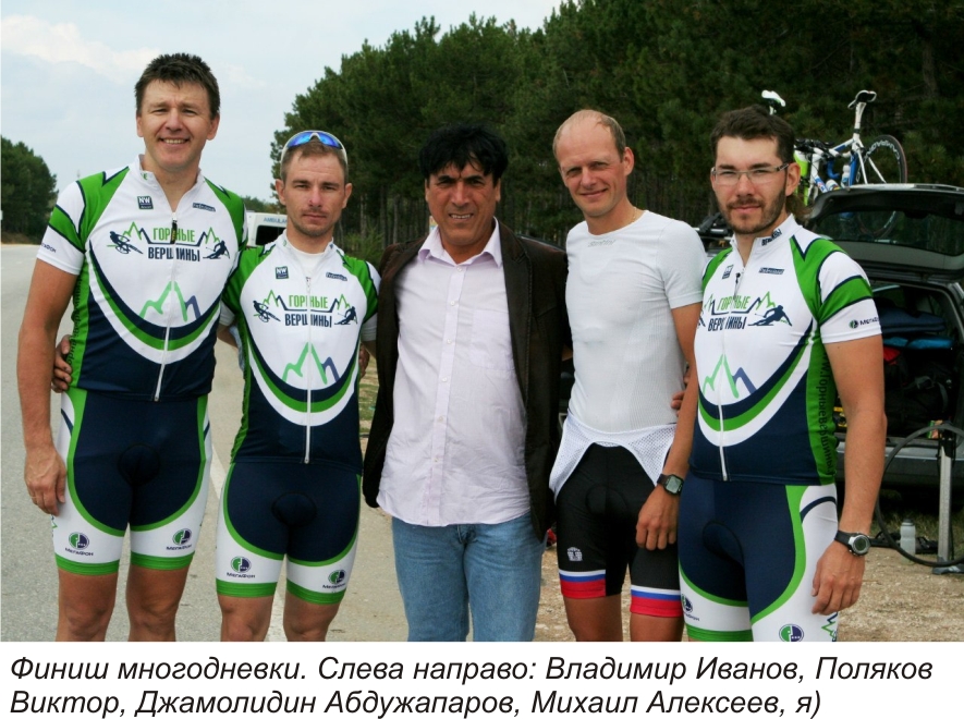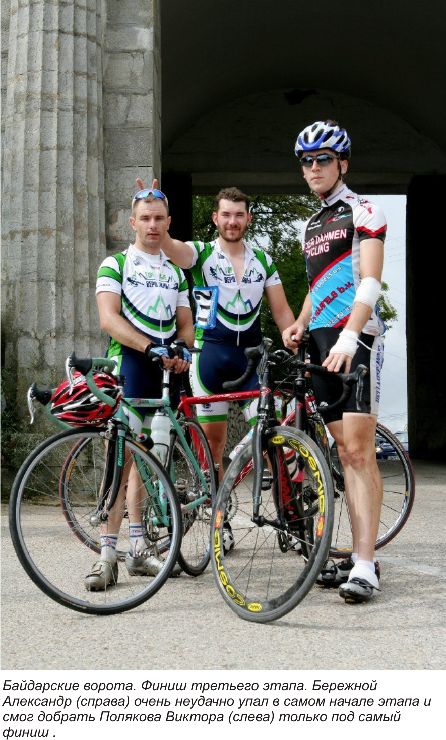 Чтобы добраться до старта третьего этапа нам опять предстоит карабкаться в гору, да еще и значительно дальше. Мы с Витей решили не искушать судьбу и сэкономить силы и, схватившись за командную техничку подьехали к старту. Все равно уставшие)). Но я поставил себе задачу во что бы то ни стало удержаться в группе. Ага! Почти сразу пошел легкий подъем серпантином и я как-то незаметно отвалил. А на серпантинистом же спуске пережимая от страха тормоза отстал еще больше. С первой догнавшей меня группкой я не удержался. Жду вторую. Вон она большая едет, там наверное хорошо. Терплю минут пятнадцать. Вроде оклимался и через еще минут пятнадцать с двумя другими массивными товарищами отъезжаем от этой группетто. Втроем ехали очень хорошо, я почти не вел. В последнюю 3х километровую горку заехал еле-еле, но уже лучше, чем вчера. Лидеры спокойно разобрались в финишный подъем. Победу опять одержал Деманов, вторым уже традиционно был Дубинец. Наш капитан, Владимир Иванов неважно себя чувстовал и приехал лишь четвертым.