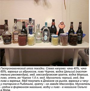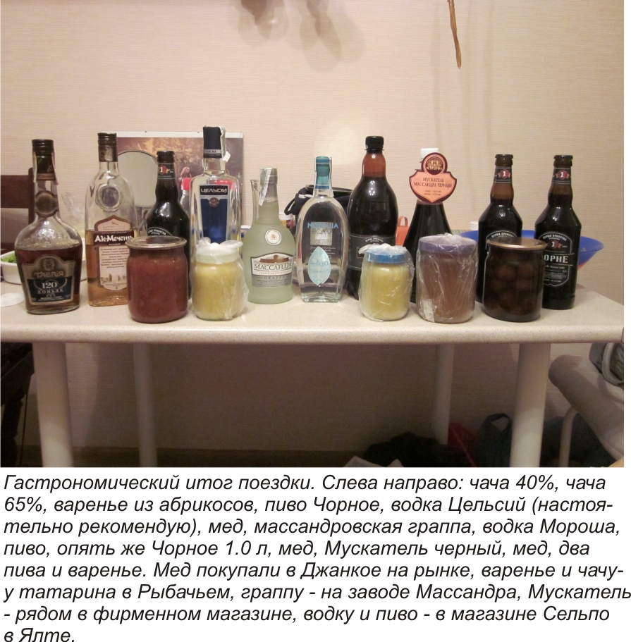 Итого: Путешествие наше длилось три недели. Удалось выполнить почти все поставленные задачи. Пять дней мы провели в Балаклаве, неделю в Ялте и пять дней в Рыбачьем + дорога с ночевками. Наколесили без малого 5 тысяч километров. На всю поездку мы истратили примерно 35 тысяч рублей, Екатерина уложилась в сумму почти в три раза меньше. Отведали местного вина, побывали на главных достопримечательностях. И купались. Так много я не купался никогда в жизни. Я сумел сравнять велосипедный загар!