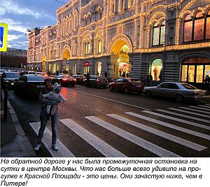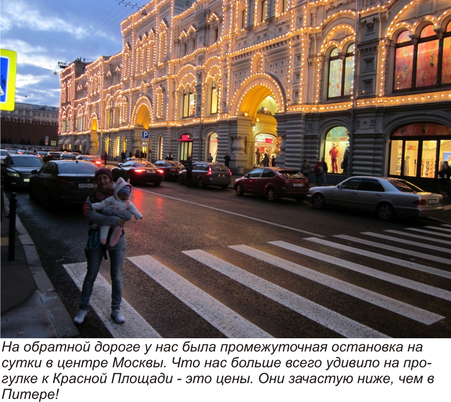 Утром были в столице. Поспали, погуляли. Отметили, что даже у Красной Площади цены на детский ассортимент аптек ниже, чем у нас, а в гастрономе№1 на самой Красной Площади продукты примерно в цену Перекрестка. Совсем зажрались! Ну и на следующее утро без пробок, спокойно доехали до Питера. Погода гадость. Собственно, такая же, как и в день отъезда, только еще дождь. Вот такое вот приключение.