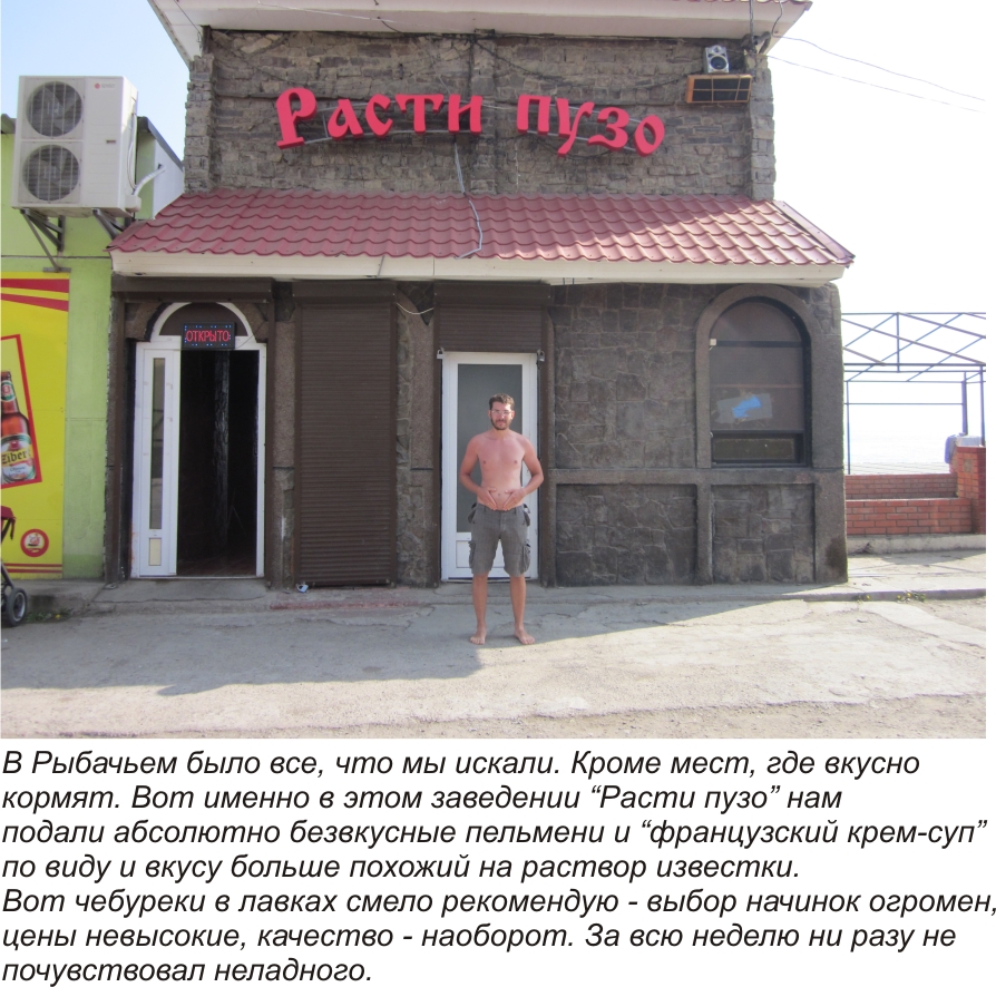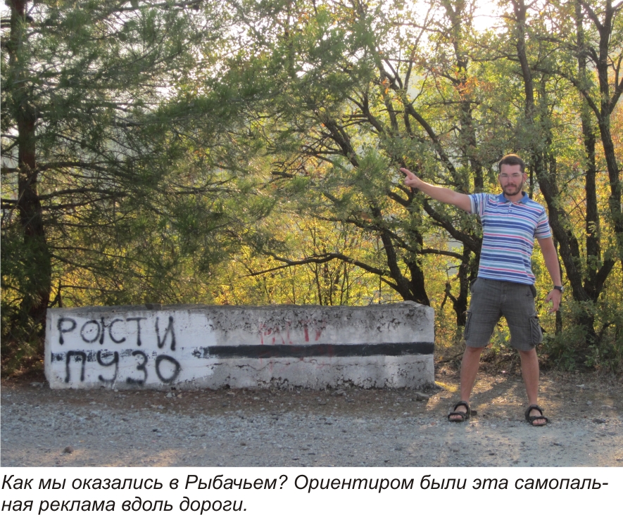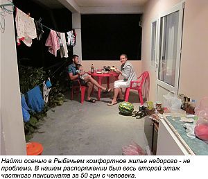 Кайфовая неделя в Ялте закончилась и мы поехали искать дикие ненаселенные пляжи и небольшие поселки, чтобы окончательно морально разложиться. Путь наш лежал в сторону Судака и поиски наши продолжались весь световой день. Я ориентировался на сумму в 50 грн с человека в сутки, то есть примерно 600 руб. в день за всех. Ну и условия должны были быть комфортными с горячей водой и вай-фаем. Заехали в Алушту не понравилось. Та же Ялта, только пожиже и побыдловее. Поехали дальше, в Семидворье. Уже хорошо: длинные галечно-песчаные пляжи, отсутствие людей. Но тут уже смутило совсем уж захолустное настроение. Приехали в Малореченск. По формату то, что надо. Поселок с каким-никаким рынком, с церквой и таким-же отличным пустынным пляжем. Но найти подходящее жилье не удалось. В итоге уже в сумерках нашли очень достойный частный пансионат в 200х метрах от моря в поселке Рыбачье. Вай-фай есть, во дворе виноград, инжир, гранат (спелые, только рви), в номерах спутниковое телевидение, горячая вода, нормальные двухспальные кровати. Берем! Тем более торговаться не пришлось за 50 грн с носу нам предоставили два больших номера с балконом. Бонусом было полное отсутствие других постояльцев.