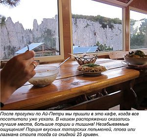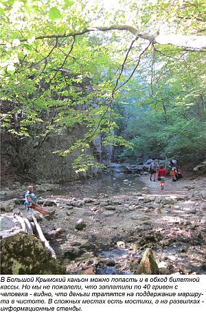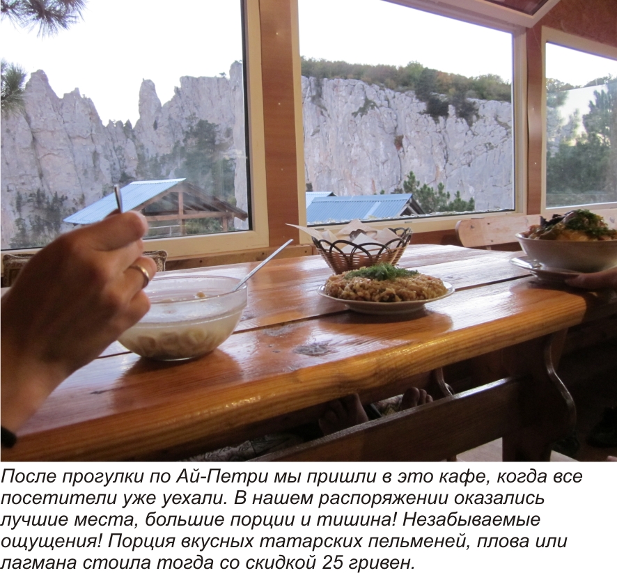 Если поедете в Большой Крымский Каньон то за вход можно не платить: по устью реки можно обойти пост. А на обратном пути загляните на Ай-Петри: примерно за час до закрытия поток туристов резко иссякает и в кафешках можно очень вкусно поужинать недорого и с великолепными видами.
