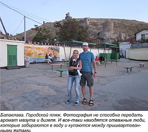 Балаклава не курортный город. Сразу же по приезду мы с Виктором отправились на море. Шли долго и упорно по азимуту. Даже смалодушничали и повернули было обратно, но местный дядечка нас развернул со словами: идите прямо, уже не много осталось. Пришли. Бетонная набережная с запахом солярки. Пляжа нет. Выхода к нормальному берегу тоже. Вобщем, покупаться не удалось.