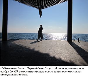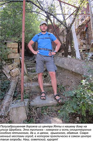 Несмотря на весьма спартанские условия проживания Ялта оставила невероятно позитивное впечатление. Каждый день пребывания в этом прекрасном курортном городе можно охарактеризовать словом со всеми большими буквами: КАЙФ! Какой же это кайф, просыпаясь в восемь утра, напялив лишь шорты, взяв голенького карапуза выйти во двор (благо первый этаж и вся эта операция занимает десять шагов) принимать воздушные и солнечные ванны! Смотреть, как виноградные лозы прогибаются под тяжестью плодов. Кайфово спускаться узенькими улочками к морю, гулять по набережной и возвращаться домой к обеду по одной из натоптанных между частными домами троп. А вечером в центре и на набережной стоит непередаваемая атмосфера советского курорта: играют уличные музыканты, танцуют пожилые пары. Народ гуляет по большей части местный, поэтому ощущение праздника не зависит от «сезона». Погода с раннего утра стоит наикурортнейшая: +27, солнечно. Дождей не обещают еще почти месяц. Вобщем, ляпота, товарищи.