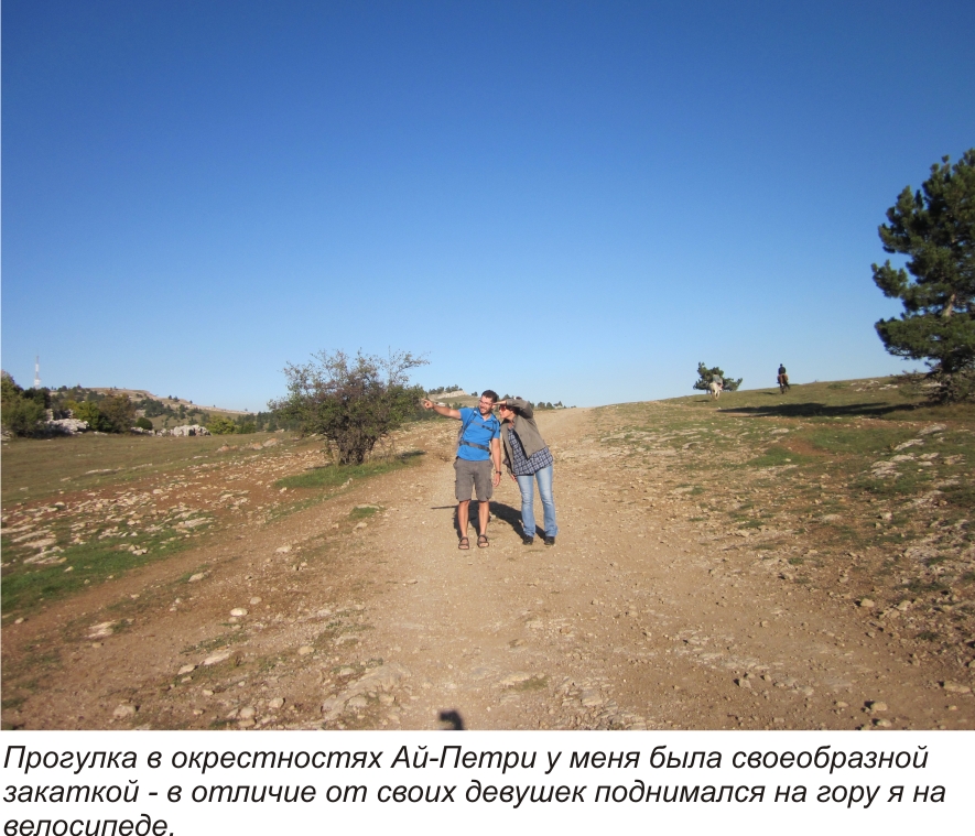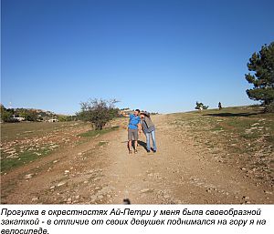 Я три раза выезжал на тренировки два раза на Ай-Петри, один раз ездил в Алупку. Самой тяжелой из этих покатушек оказалась алупкинская. Уж больно суров серпантин подьемы не затяжные, но довольно крутые, а на спусках отдохнуть не получалось. Подьемы в Ай-Петри давайлись гораздо легче. Во второй раз удалось забраться на 7 минут быстрее первого. Прогресс не только ощущался, но и был подтвержден секундомером, что весьма меня взбодрило. Вообще, для езды на шоссере Ялта подходит очень хорошо пока выедешь из города уже прошло полчаса, еще по большой Ялте полчаса, там в горы часик и обратно. Итого легко и незаметно от двух часов!