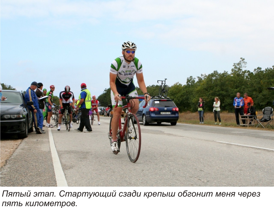 Стартовый отрезок такой-же, как и на втором этапе. И вот теперь-то уж точно нельзя отваливать. В группе держусь уже значительно увереннее. Вот он тот самый подьем, на котором я тогда отвалил. И ситуация начинает повторяться вновь. Я полощусь сзади, струна начинает натягиваться… Я на зубах, на деснах даже, перекладываюсь. Сначала на последнего, потом повыше. Минуту на вылезание из под руля и я уже плотно в первой пачке! И здесь легко! И я вижу, как те, кто не сел, упираются, но стремительно отсасывают. А я слегка кручу и мне хорошо! Мы проезжаем легкие холмики, крутые повороты, струна натягивается, группа собирается. А шоссейные гонки это оказывается кайф! Так я наслаждаюсь собственной крутизной от пребывания в первой пачке минут сорок, наверное. До подьема в три километра и градиентом в 6%. Решаю не упираться до последнего, а ровненько заехать, дабы не подохнуть, ведь, судя по роудбуку, предстояло еще два таких подьема. Пачка прогнозируемо, но не стремительно уезжает. А я мотивируюсь видом парня из моей группы 30ти летних, который никого не стесняясь заезжает на вершину, держась за свою техничку! Ай-яй-яй!! В любительских гонках часто закрывают глаза на подобные нарушения и все, что я мог сделать в подобной ситуации это сильнее давить на педали. Утерев пот со лба и стиснув покрепче зубы я сел ему на колесо и не пожалел! На спуске он устроил головокружительный даунхил, прошивая мелкие группки с такой разницей в скорости, что те даже и не думали садиться на колесо. И уже после выполаживания еще минут пять мы крутитли края, добирая довольно большую группу. В которой оказался и Саша Бережной, который отьехал от меня в самом начале подьема. Вот такой группой мы и ехали минут двадцать, предпринимая атаки в немногочилсенные подьемы. А я все готовлюсь к паре таких же подьемов и расчитываю ехать еще минимум час. И тут мы выезжаем на ялтинское шоссе с крупной надписью на проезжей части: «финиш 1 км». Опачки, как же так? А где же все эти горы и километры? Я, конечно, не стал настаивать. Тем временем наша группа уже начала тактические перестроения. Здесь уже нужно включаться по полной и не щелкать клювом. У меня получилось выполнить оба этих «совета». Во время одного из перестроений я с двумя гонщиками отъехал немного от группки. Удалось даже разыграть финиш. Гонка становится интересной. В стане лидеров все по-прежнему: первым линию финиша пересек Деманов, за ним Дубинец. Наш Владимир заехал третьим в своей группе.