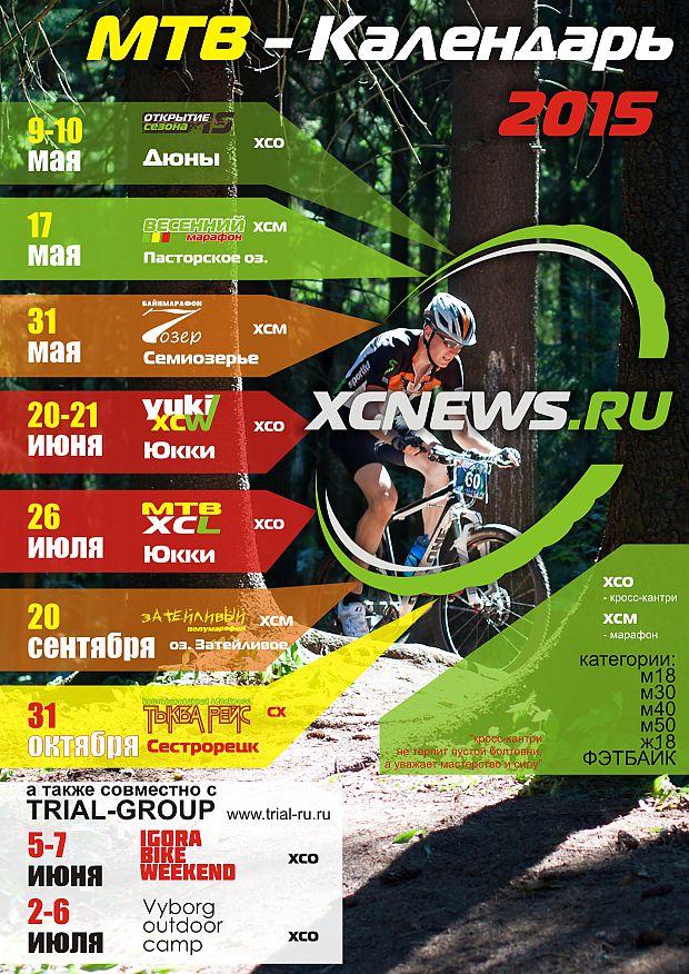 Уважаемые любители горного велосипеда! Представляем вам календарь наших гонок на сезон 2015 г. Наш конек техничные трассы. В этом году мы предлагаем все самое лучшее, что есть в нашем запасе техничные и скоростные трассы Дюн, каменные трассы Выборга, живописнейшие трейлы марафона 7 озер и Затейливого полумарафона и, конечно, центральные события сезона техничный Весенний марафон с обилием тропинок, мостиков и спусков и две гонки по знаменитой трассе в Юкках. Завершит сезон веселое мероприятие костюмированный велокросс Тыква-Рэйс. А теперь обо все по-подробнее.