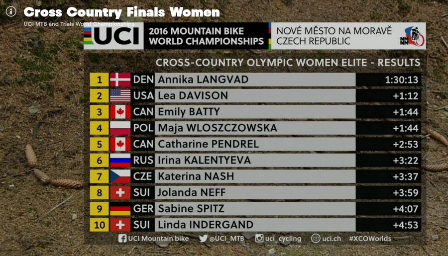 Необычайно драматичным выдался женский заезд Чемпионата мира по кросс-кантри, только что завершившийся в чешском Нове Место. Когда по результатам предпоследнего, четвертого круга казалось, что подиум уже определился, два пробоя задних колес внесли неожиданные коррективы. После пробоя колеса в крайне неудачном месте круга у Сабины Шпиц, с 20-секундным отрывом от ближайшей преследовательницы шедшей на бронзу, ехавшая за ней Ли Дэвисон становится претенденткой на третье место, и буквально через несколько минут уже на второе неудача постигает Майю Влощовскую. Замена колеса откидывает ее со второй на четвертую позицию, с отрывом в несколько секунд от выходящей на третье место Эмили Бэтти. Мощная погоня, финишный спурт с «протягиванием» велосипедов в финишный створ, но тем не менее с отрывом в миллисекунды Бэтти защищает свою бронзовую медаль. Ирина Калентьева, не очень удачно стартовав, с восьмой позиции в середине гонки переместилась на шестую в финишном протоколе, в том числе благодаря техническим проблемам у Сабины Шпиц, финишировавшей следом за ней, но с более чем минутным отставанием.