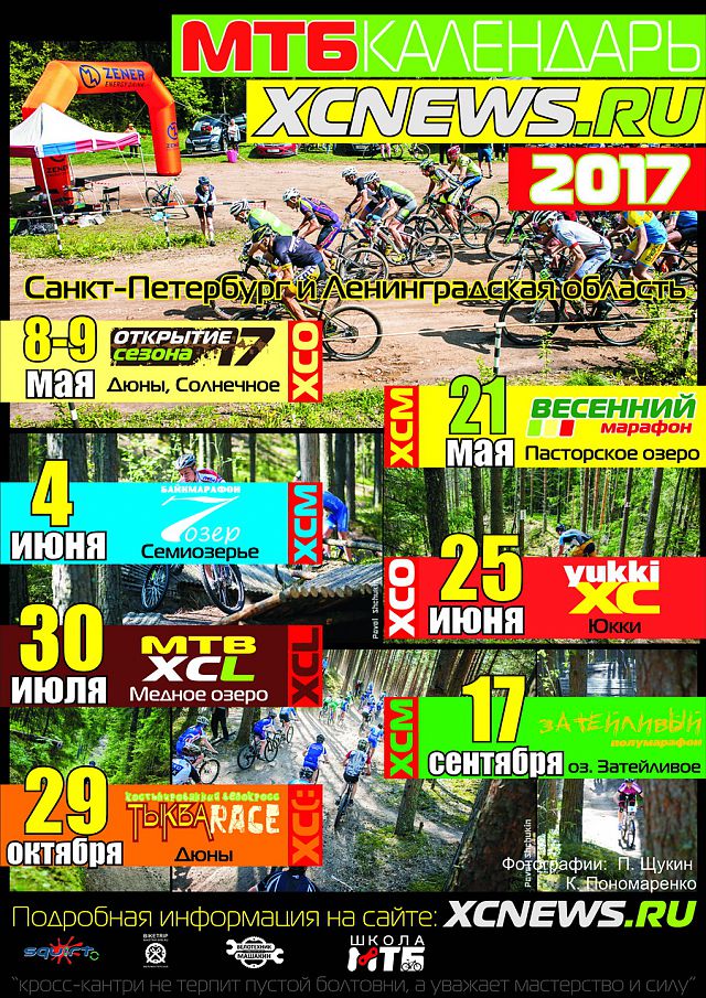 Уважаемые любители горного велосипеда! Представляем вам календарь наших гонок на сезон 2017 г. В этом году мы предлагаем все самое лучшее, что есть в нашем запасе — техничные и скоростные трассы Дюн, живописнейшие трейлы марафона 7 озер и Затейливого полумарафона и, конечно, центральные события сезона — техничный Весенний trail марафон с обилием тропинок, мостиков и спусков, а также гонка по легендарной трассе в Юкках и возвращение XCLonga. Завершит сезон веселое мероприятие — костюмированный велокросс Тыква-Рэйс. Кроме того, мы проведем 3 трейла для любителей бега по пересеченной местности эти соревнования также включены в наш календарь. А теперь обо всем по-подробнее.