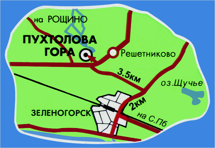 - на машине: по верхнему или нижнему шоссе до Зеленогорска. При въезде в Зеленогорск по верхней трассе сразу поворот направо по указателю, под ж/д мост. Далее 2 км и поворот налево (указатель). Проезжаем через ж/д переезд. Доезжаем до Т-образного перекрестка (3,5 км) - поворот направо по указателю. Еще немного и упираемся в еще один ж/д переезд. Перед ним по указателю налево и дорога почти упирается в горнолыжный склон.