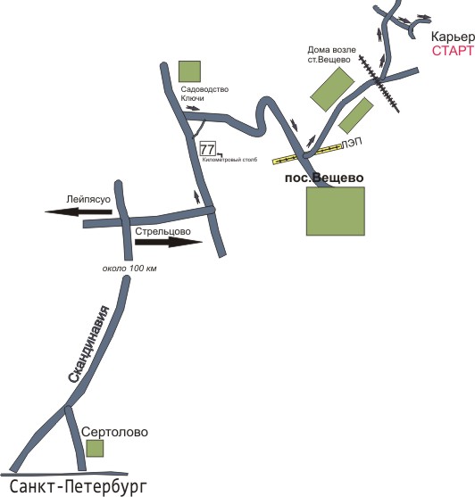 Двигаясь по трассе Скандинавия в сторону Выборга, после столбика 113 от Спб , на развилке с крупным дорожным указателем налево - Лейпясуо, направо –Стрельцово, повернуть направо.
