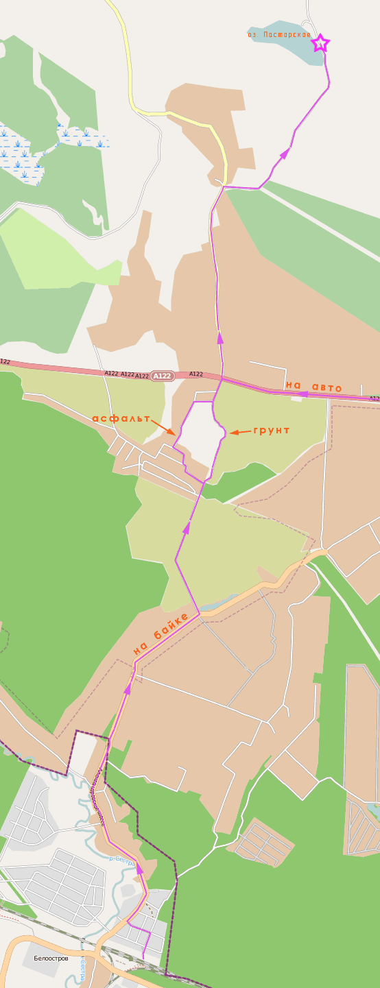 7) едем 2 км по асфальту до Пасторского озера, перед самым озером асфальт закончится.