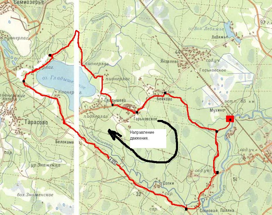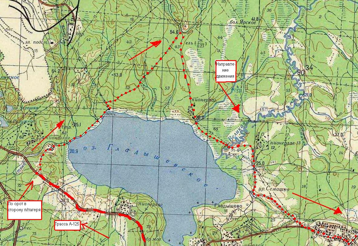 - Далее по проселочной дороге, через пионерлагерь (направление север, северо-восток), по лесной дороге к берегу Гладышевского озера, вдоль берега озера по лесной дороге до водокачки.