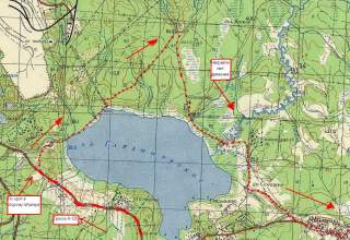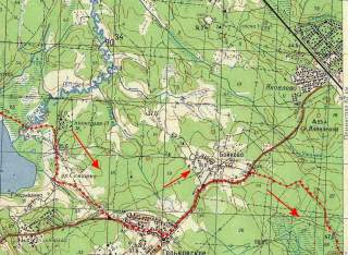 - Далее поворот на юг, юго-восток по направлению к озеру Гладышевскому, через пионерлагерь, через мост (река Великая) до Дома отдыха