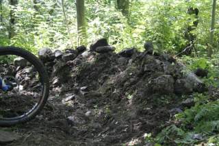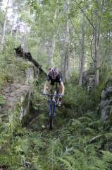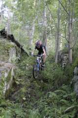 Последующий выкат на поляну Чертового стула ведет к новому спуску со скалы с правой стороны. Этот жуткий участок в расщелине между скал добавит адреналина в кровь многих участников. В принципе этот спад проезжается на тормозах, поэтому реально травмоопасным его назвать, надеюсь, не придется.