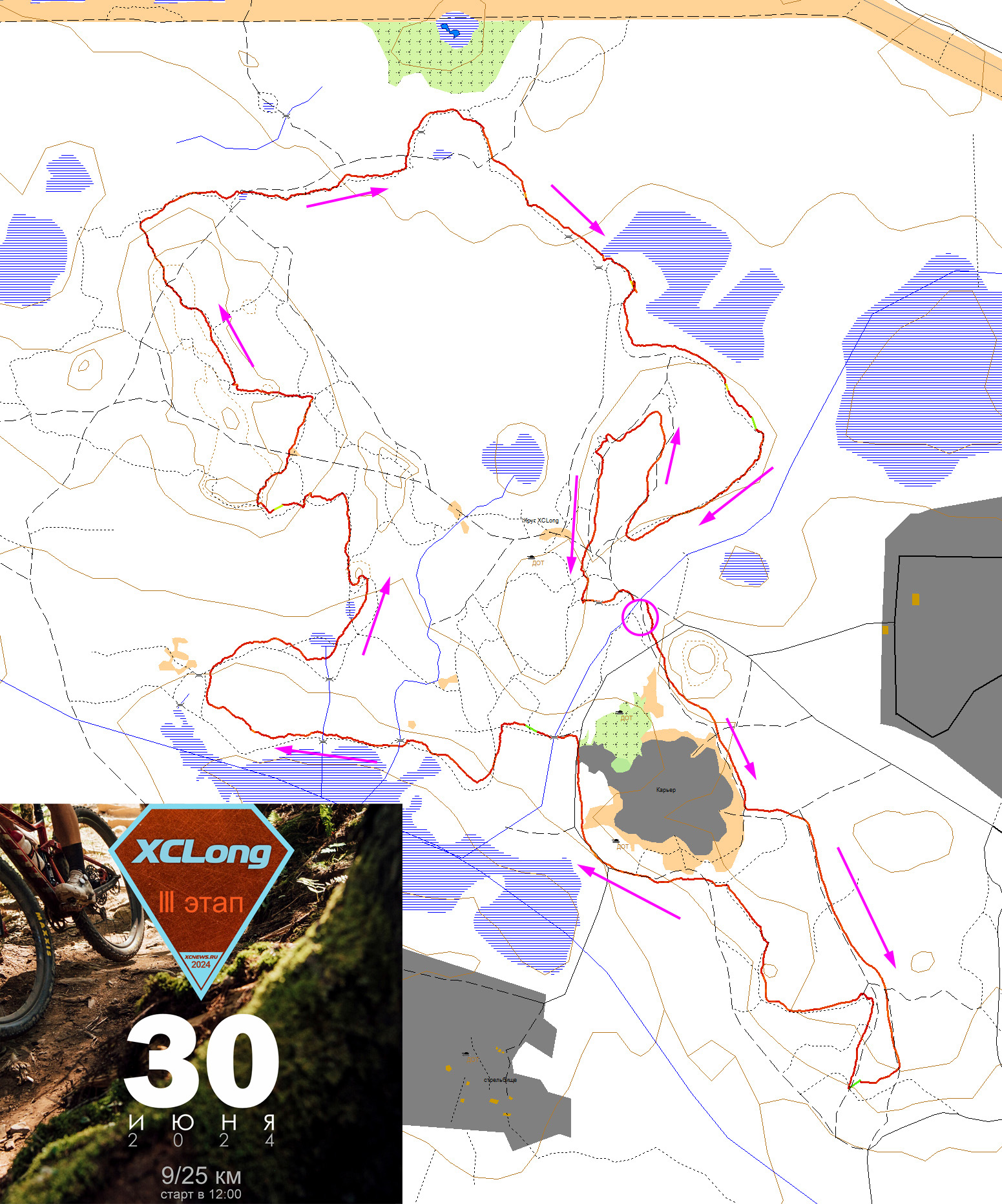 Трасса гонки Медный XCLong представляет собой круг длиной 8 километров, проложенный по лесным тропинкам и специально подготовленным трейлам, а также, в минимальном количестве, по грунтовым дорогам. Отсутствие запредельно сложных технических элементов и относительно большая длина круга роднят дистанцию с марафонской, но, с другой стороны, масса синглтреков, на которых флоу-секции перемежаются с непростыми спусками и подъемами, дают в полной мере ощутить все прелести гонки кросс-кантри. Трасса обладает умеренно выраженным рельефом, через ручейки и заболоченные участки проложены мостики различной длины. Полная дистанция - три круга, сокращенная - один. Уходу на первый круг будет предшествовать разгонная петля длиной 1 км.