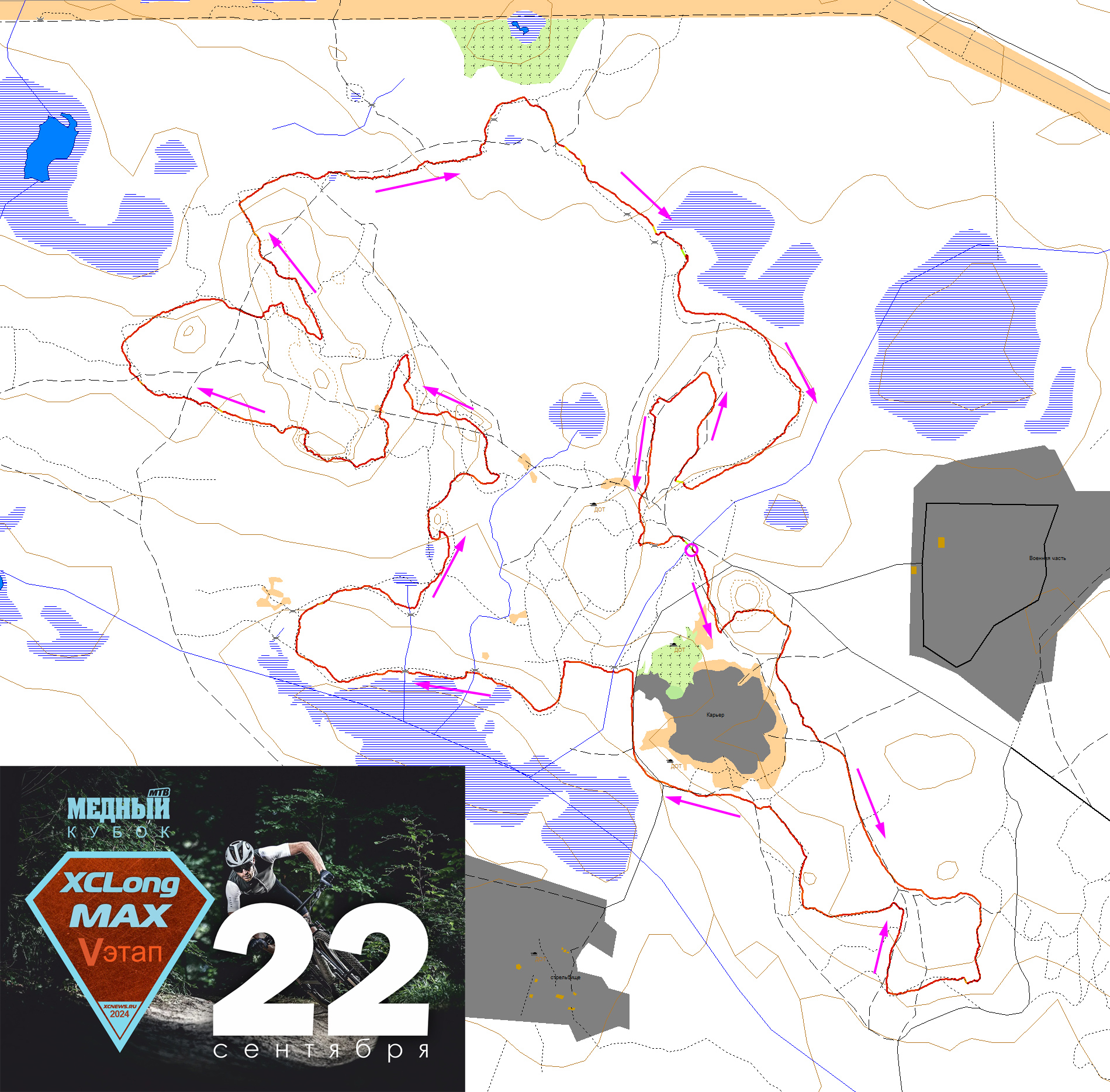 Трасса гонки Медный XCLongMAX представляет собой круг длиной 10 километров, проложенный по лесным тропинкам и специально подготовленным трейлам, а также, в минимальном количестве, по грунтовым дорогам. Отсутствие запредельно сложных технических элементов и относительно большая длина круга роднят дистанцию с марафонской, но, с другой стороны, масса синглтреков, на которых флоу-секции перемежаются с непростыми спусками и подъемами, дают в полной мере ощутить все прелести гонки кросс-кантри. Трасса обладает умеренно выраженным рельефом, через ручейки и заболоченные участки проложены мостики различной длины. Полная дистанция - три круга, сокращенная - один. Уходу на первый круг будет предшествовать разгонная петля длиной 1 км.