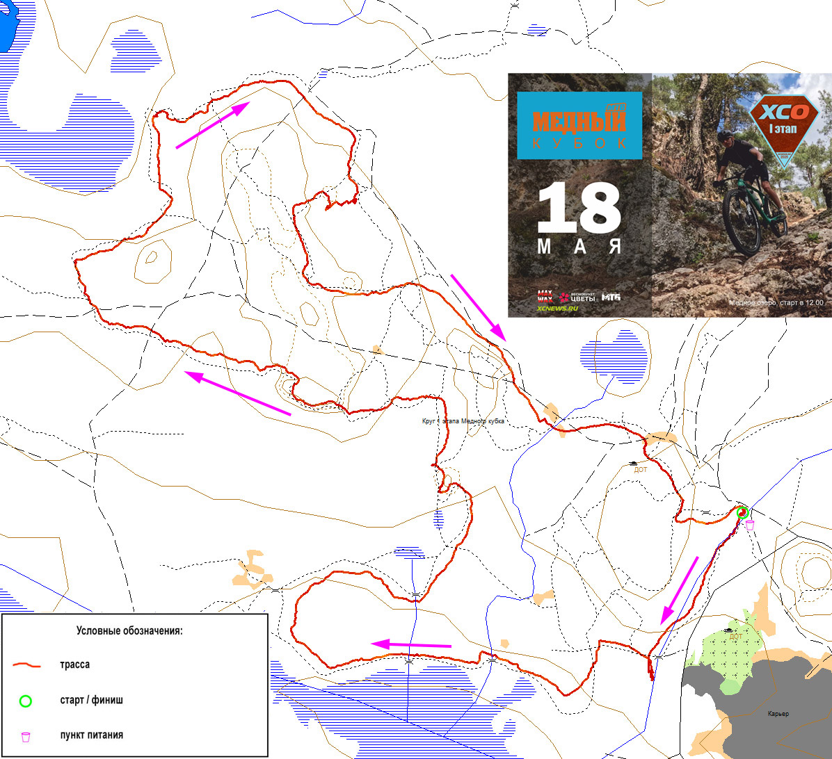 Трасса Медного XCO - I этапа Медного Кубка 2025 представляет собой круг длиной 5,4 км с набором порядка 120 метров, проложенный преимущественно по специально подготовленным трейлам. Дистанция обладает умеренно выраженным рельефом. Ближе к концу круга присутствует недлинный участок грунтовой дороги. Конфигурация трассы будет по большей части повторять прошлогодний I этапа Кубка, но добавится новый трейл со спуском и подъемом. Уходу на первый круг будет предшествовать разгонная петля длиной 1 км.