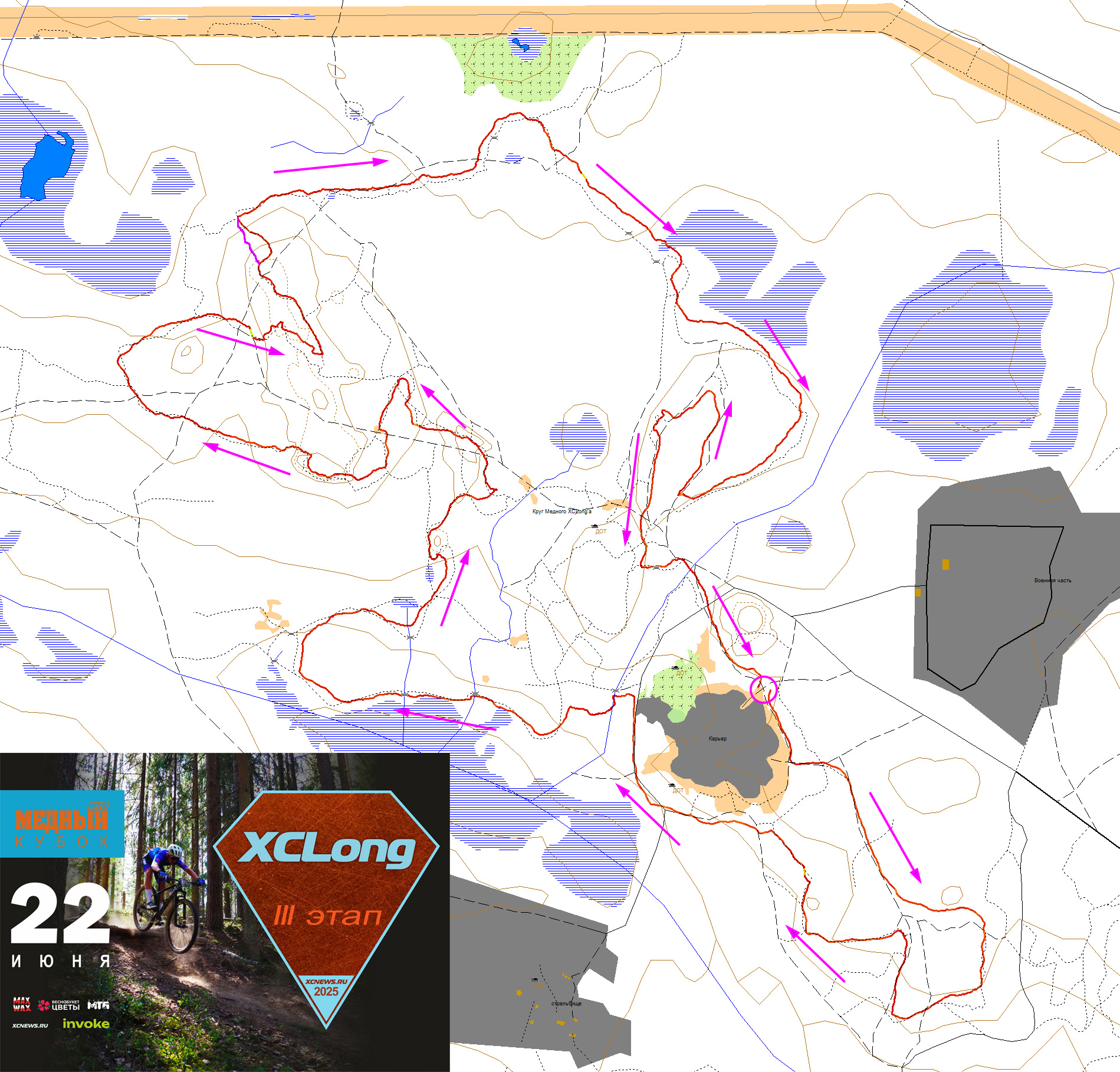 Трасса гонки Медный XCLong представляет собой круг длиной 10 километров, проложенный по лесным тропинкам и специально подготовленным трейлам, а также, в минимальном количестве, по грунтовым дорогам. Отсутствие запредельно сложных технических элементов и относительно большая длина круга роднят дистанцию с марафонской, но, с другой стороны, масса синглтреков, на которых флоу-секции перемежаются с непростыми спусками и подъемами, дают в полной мере ощутить все прелести гонки кросс-кантри. На трассе присутствуют несколько прыжковых элементов, большая часть которых может преодолеваться накатом, без использования прыжковой техники. Для участка с разрывным трамплином предусмотрена альтернативная (объездная) траектория без технических элементов, но с небольшой потерей времени (на карте трассы технически сложный участок отмечен фиолетовым цветом). Трасса обладает умеренно выраженным рельефом, через ручейки и заболоченные участки проложены мостики различной длины. Полная дистанция - три круга, сокращенная - один.